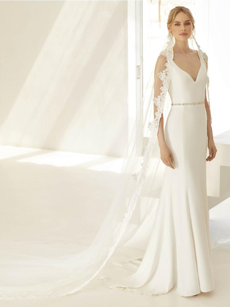 Este elegante velo de Bianco Evento completará tu look de novia. Este velo de una capa está hecho de tul diamante con borde de encaje con cuentas de cristal. Lleva una peineta que facilita la colocación del velo en el pelo.
