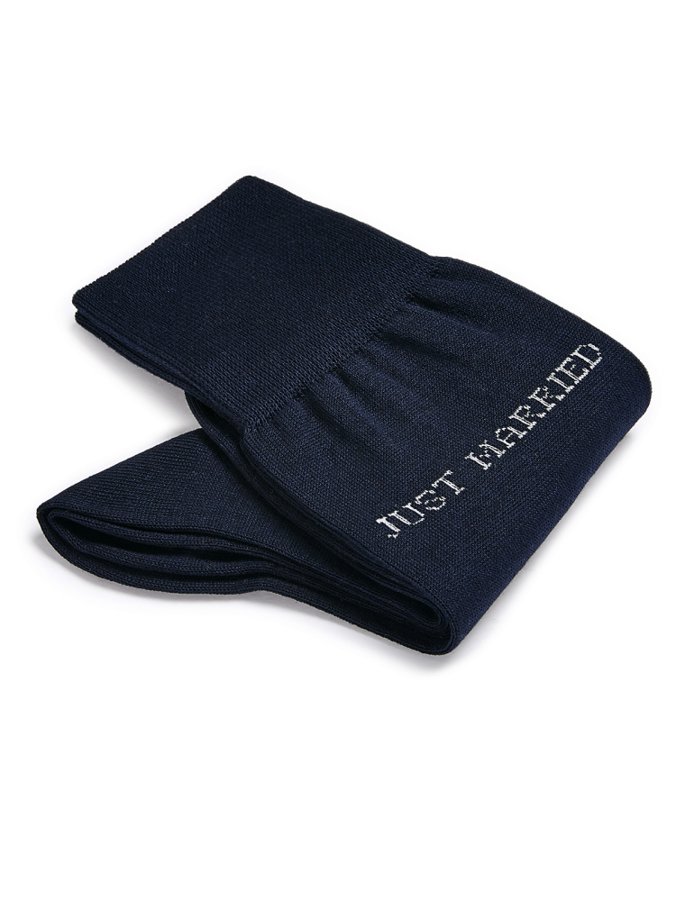 Estos calcetines Just Married de color azul oscuro están diseñados especialmente para el futuro novio.
