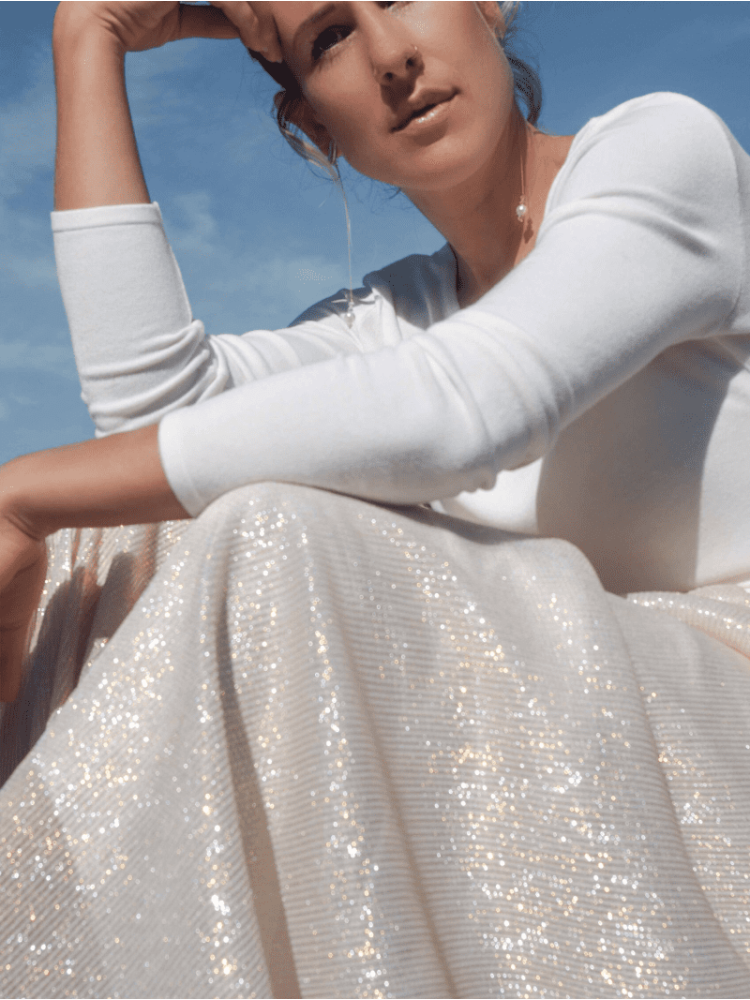 Esta preciosa falda R5634 es una falda de novia plisada brillante. Esta encantadora falda está confeccionada con un fluido tejido de punto plisado de color marfil, intercalado con hilos de lúrex dorados y plateados. Tiene forro elástico y una cómoda banda elástica en la cintura. La falda tiene un borde sin rematar en el bajo, por lo que se puede acortar fácilmente.