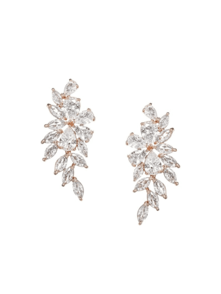 Estos preciosos pendientes de oro rosa están compuestos por un impresionante arreglo de brillantes piedras de circonita cúbica. Los pendientes chapados en oro rosa deslumbrarán en su día especial y darán el toque final a su traje de novia. Los pendientes tienen una longitud de 3,5 cm. Estos aretes también están disponibles en plata.