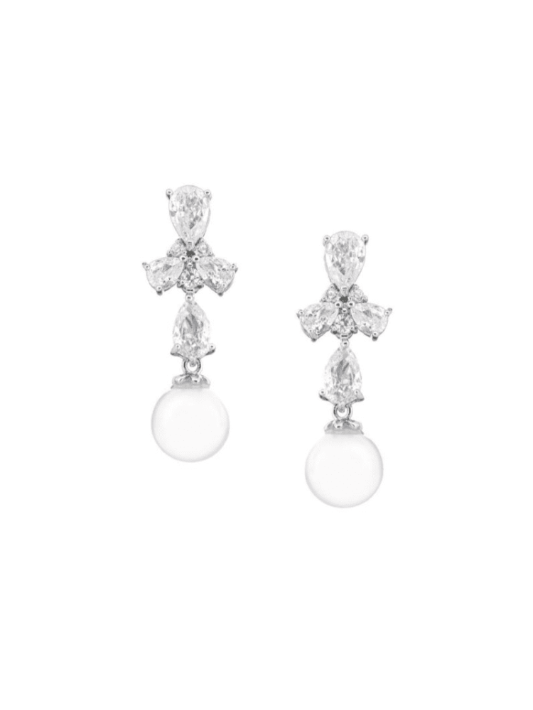 Estos preciosos pendientes de plata están compuestos por un impresionante conjunto de brillantes piedras de circonita cúbica. Las perlas marfil de los pendientes los hacen muy modernos y chics. Quedarán fantásticos combinados con su vestido de novia. Los pendientes chapados en rodio deslumbrarán en su día especial y darán el toque final a su traje de novia. Los pendientes tienen una longitud de 4,8 cm.
