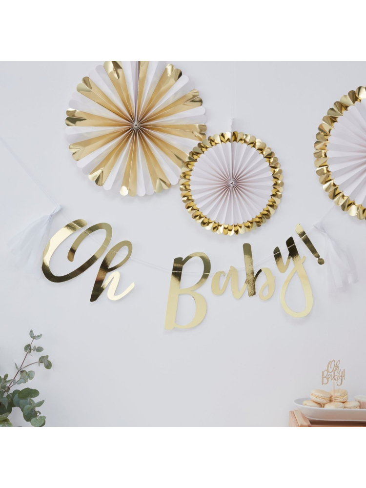 Esta guirnalda dorada Oh Baby Sling es un imprescindible para la fiesta de bebé.