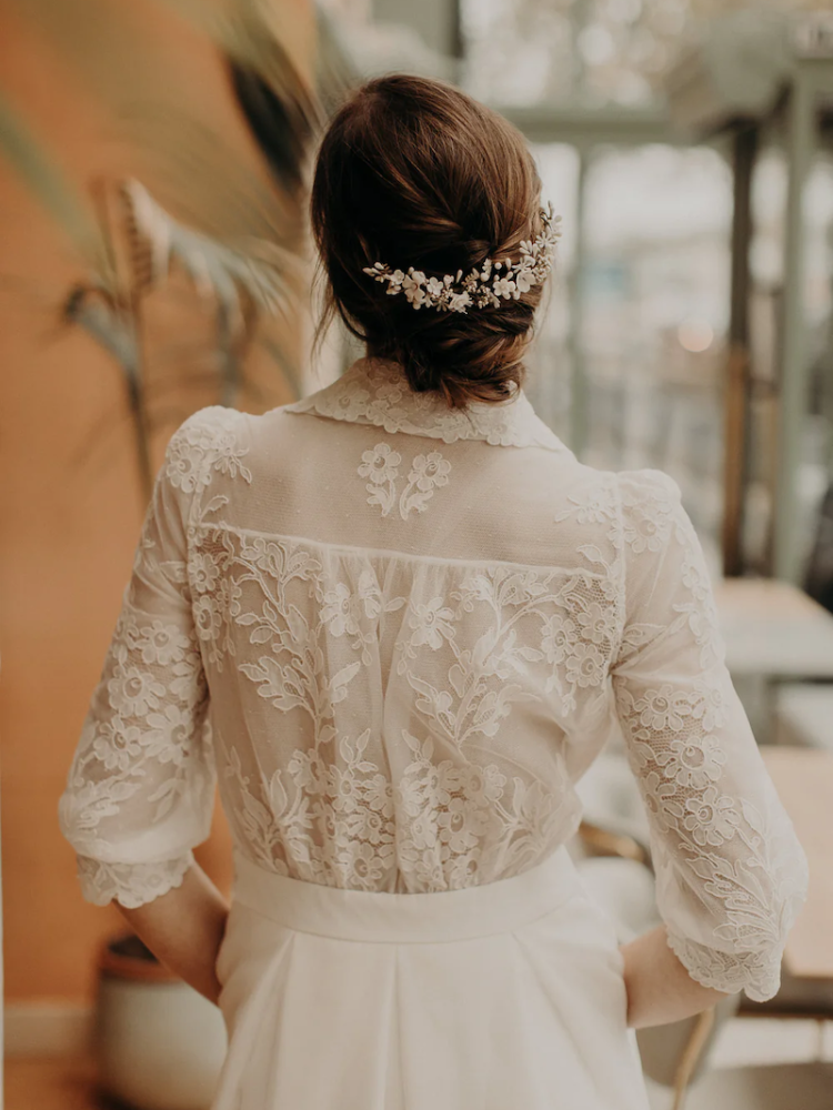 El peine de cabello Perrine de Lizeron es un accesorio bellamente artesanal que añade un toque romántico a cualquier peinado. Con una longitud de aproximadamente 20 cm, cuenta con una generosa disposición de delicados elementos de porcelana, todos meticulosamente elaborados a mano. Diseñado para asegurarse con horquillas, el peine Perrine se integra perfectamente en diversos peinados, realzando tu look con su diseño intrincado y elegante. Una ligera bruma de laca para el cabello puede realzar el brillo perla de la porcelana, añadiendo un acabado lustroso; sin embargo, si prefieres mantener su apariencia mate original, es mejor evitar el uso de laca. Eleva tu peinado con el peine de cabello Perrine, una pieza atemporal que combina el encanto clásico con la elegancia moderna.