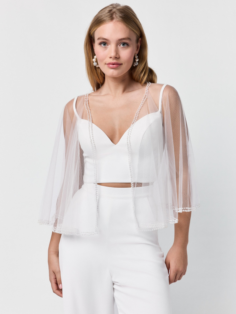 Realza tu look nupcial con la refinada elegancia de la Capa Poirier C-75104. Elaborada con delicada tul de ivoire, este diseño etéreo se desliza suavemente sobre los hombros, creando una silueta suave y romántica. La capa cuenta con mangas cortas y fluidas, y está acabada con dos exquisitas filas de perlas a lo largo del dobladillo, cada hebra añadiendo una textura elegante y un sutil destello.