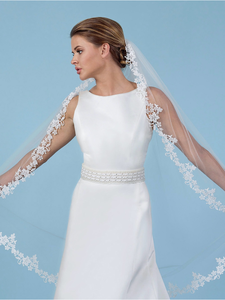 Velo de tul suave con encaje floral de ganchillo.