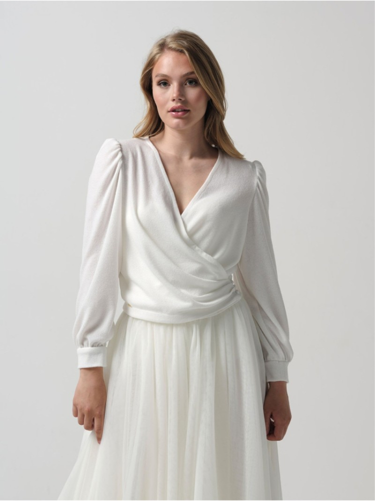 Elegante top con escote en V de la Essential Collection de Poirier. Esta prenda se ata a un lado y tiene mangas largas. Combina este top con todas las faldas de novia de Poirier para un look espectacular y cómodo. Perfecto para lucir con estilo en tu gran día.