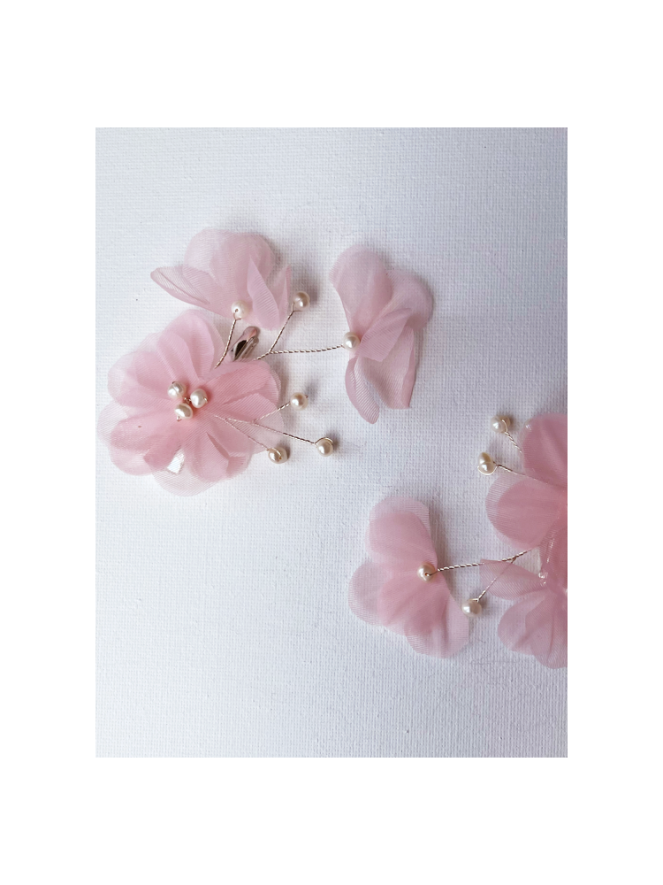 Horquillas plateadas con flores de tela y perlas de agua dulce. Un toque romántico y elegante para tu peinado de novia.